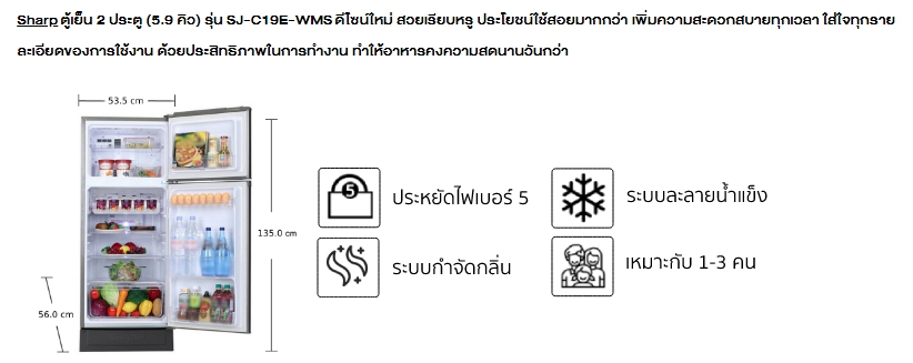 ตู้เย็น SHARP ขนาด 5.9 คิว รุ่น SJ-C19E-WMS สีเทา