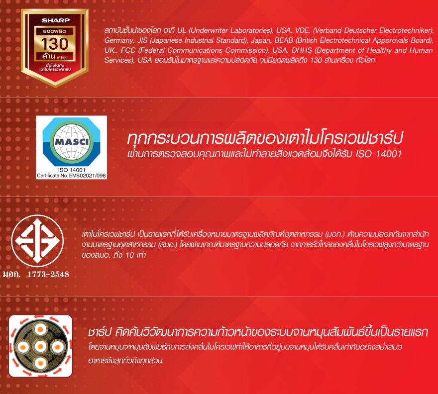 - อื่นๆ : ระบบ 2 PLUS 2 ให้คุณสนุกสนานกับการทำอาหาร ระบบไมโครเวฟผสมย่าง (COMBI) ช่วยให้อาการสุกทั่วถึง กรอบนอก นุ่มใน โปรแกรมอัตโนมัติ 6 โปรแกรม โปรแกรมป้องกันเด็กเล่นเครื่อง (CHILD LOCK)